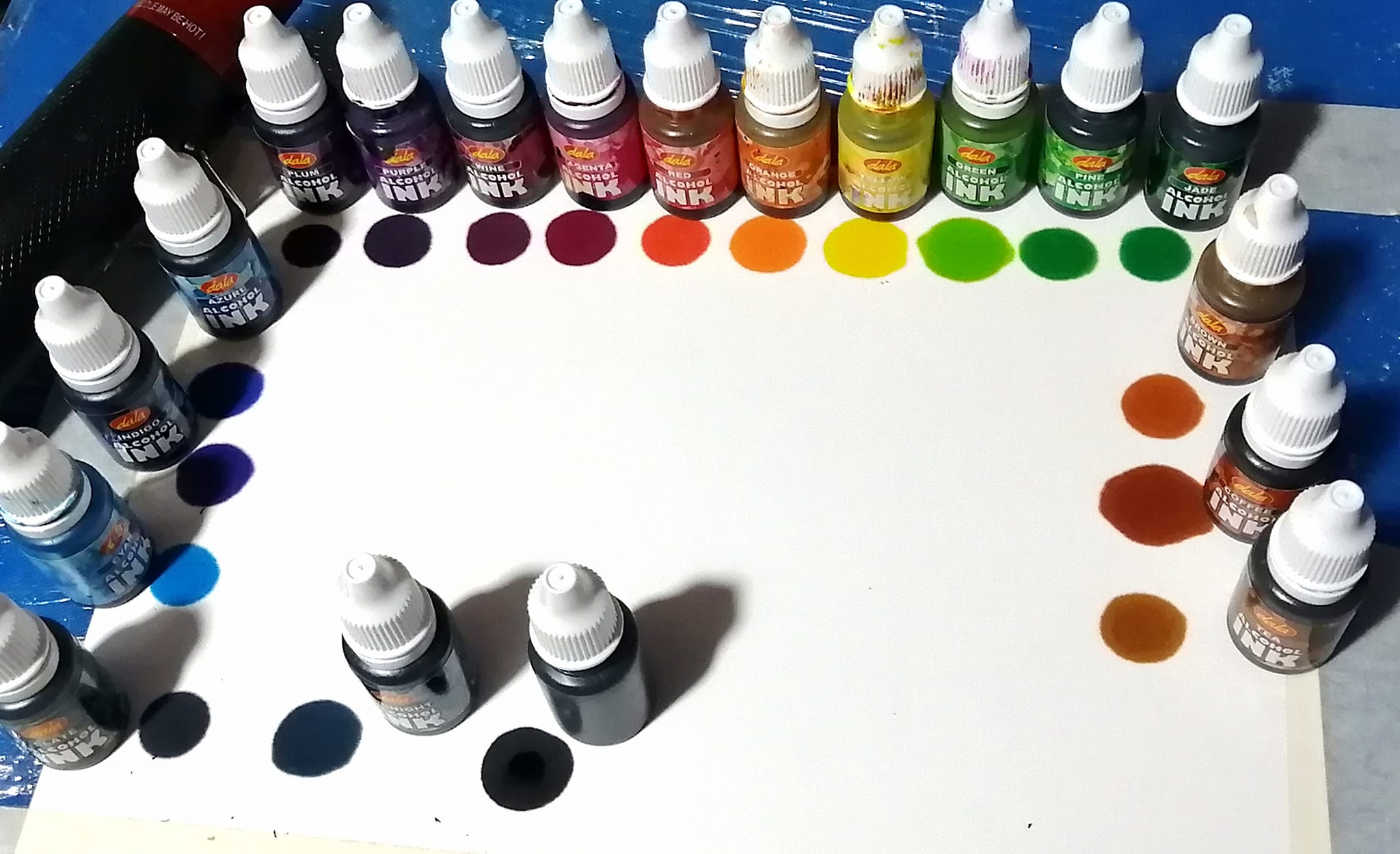 Dala Alcohol inks are highly saturated, translucent and fast drying. They can be used on any hard surface, glass, plastic, ceramic, stone, metal, leather, polymer clay, resin and more.