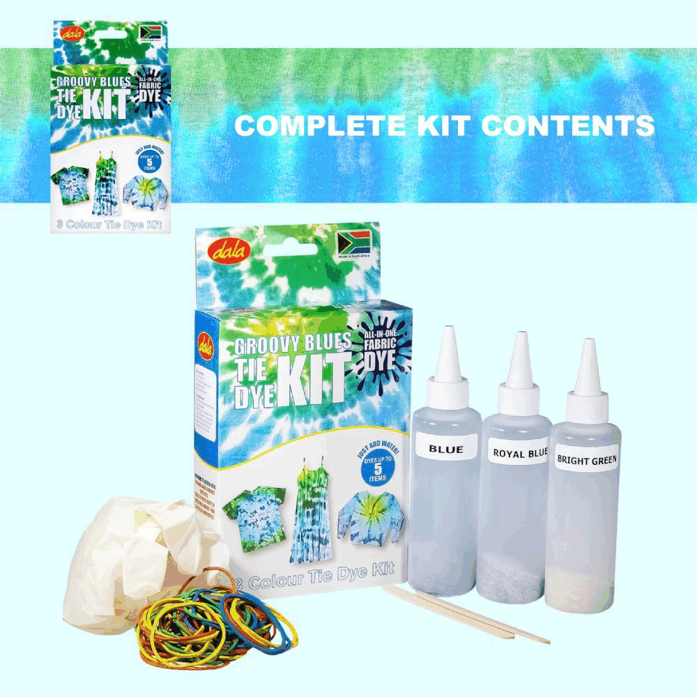 Create groovy tie dye designs with Dala’s Groovy Blues Tie Dye Kit. Just add water and it dyes up to 5 items.