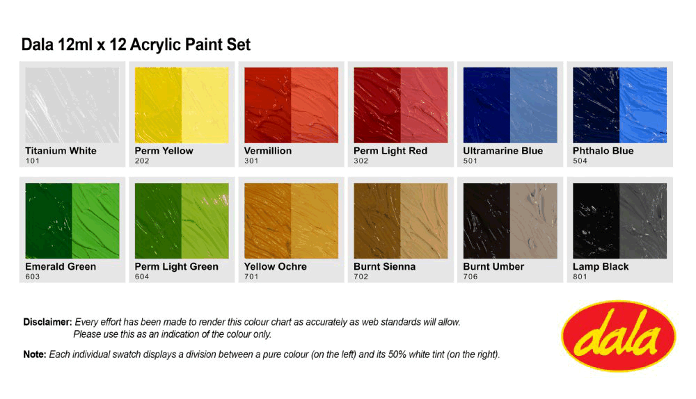 Dala Acrylic 12 x 12ml tube sets are perfect for beginners and seasoned artists alike as they include essential traditional artists shades to aid in perfect colour blending, or pure bold colour straight from the tube.